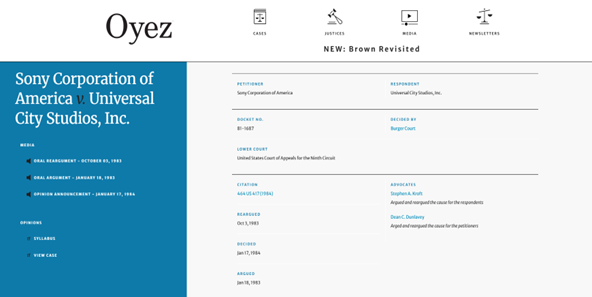 ここでは、一例として、フェアユースに関する現行法最初の最高裁判決であるSony Corporation of America v. Universal City Studios, Inc.(1984)(以下「ソニー判決」といいます。)を取り上げます。Oyezでは次のような画面が表示されます[i]。