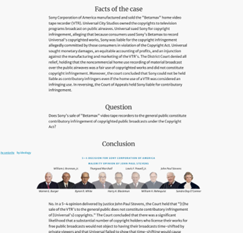 事実の概要、最高裁での論点、結論が表示されます。ソニー判決では、5対4の僅差で、ソニーのビデオカセットテープの製造・販売行為が著作権の寄与侵害を構成しないと判示されましたが、どの裁判官が法廷意見(多数意見)に与し、その意見を起草したのが誰なのか(本件はジョン・ポール・スティーブンス判事)が一目瞭然です。