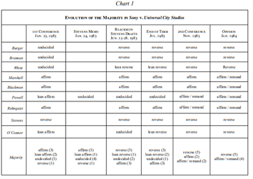 以上のように裁判官の個性の違いを知ることができるだけなく、最高裁判事の間でどのような意見の相違や変遷があったのかについても我々が知ることができる場合があります。例えば前述のソニー判決では5対4でソニーが勝訴しましたが、口頭弁論直後の時点では、ほぼ4対5でソニー敗訴の可能性が高い状況でした。最終的に法廷意見になったスティーブンス判事の起草した意見は、当初は反対意見として用意されたものでした(各判事の意見の変遷は以下の表のとおり)。[x]